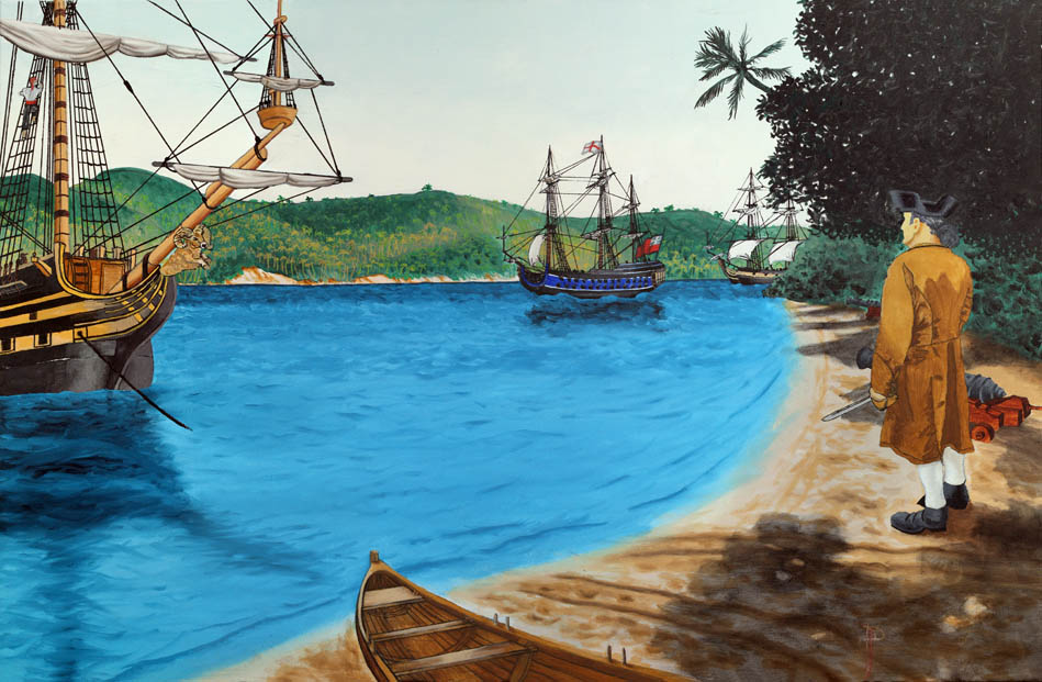 As for the influences for his art, Palumbo points first and foremost to his own hobbies of reading and sailing. He has read countless books on and stories about pirates, sea battles, and sailing in general, and these deeply inspires him. Some of his favorites are Moby Dick, True Tales of Buried Treasure, and Mutiny and Murder. Additionally, the often rugged style of his paintings was inspired by the hardly “romantic” lifestyle of vagabonds which he read countless books about. After having read these books, he was inspired to do some traveling. Among his destinations were Marshfield, Massachusetts to visit Edward Rowe Snow an author of pirates books, books on murders, ghost stories and hounted lighthouses, ect. After visiting with him, he went into New York for the tall ships festival. Another trip was to Toronto Canada to sail on the Pathfinder for a week then his hitchhike back home.